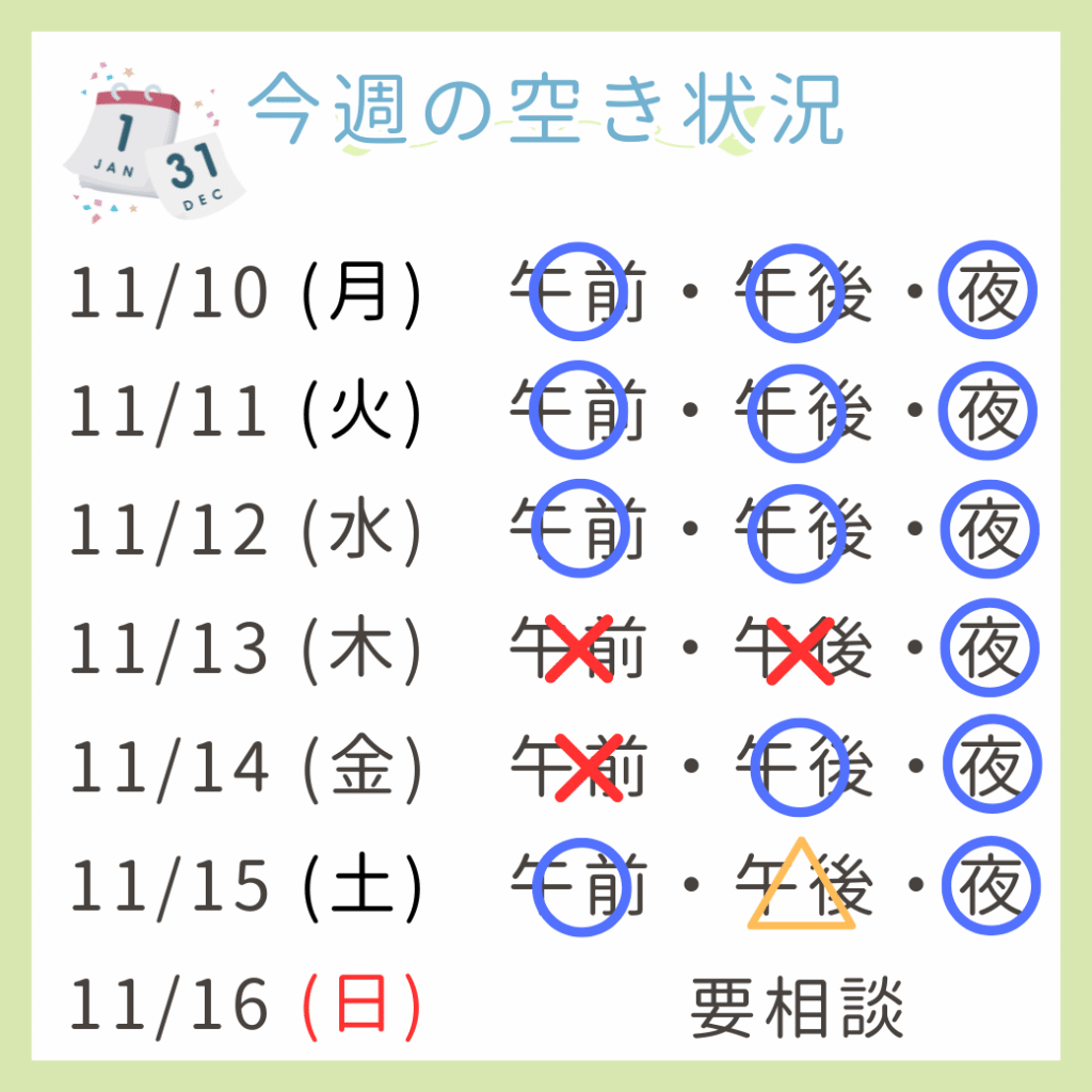 今週11/10(月)〜11/16(日)の予約の空き状況になります🗓️