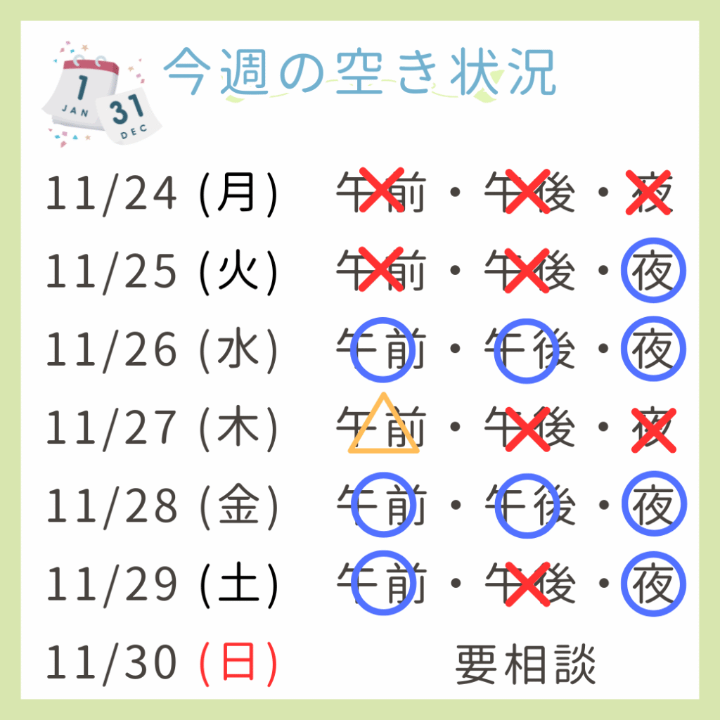 今週11/24(月)〜11/30(日)の予約の空き状況になります🗓️