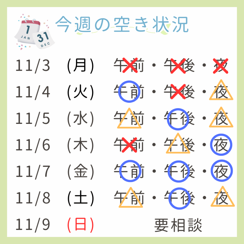 今週11/3(月)〜11/9(日)の予約の空き状況になります🗓️