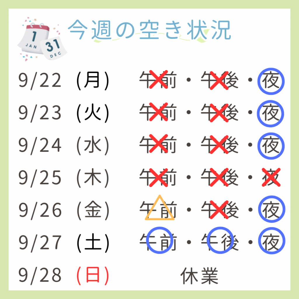 今週9/22(月)〜9/28(日)の予約の空き状況になります🗓️