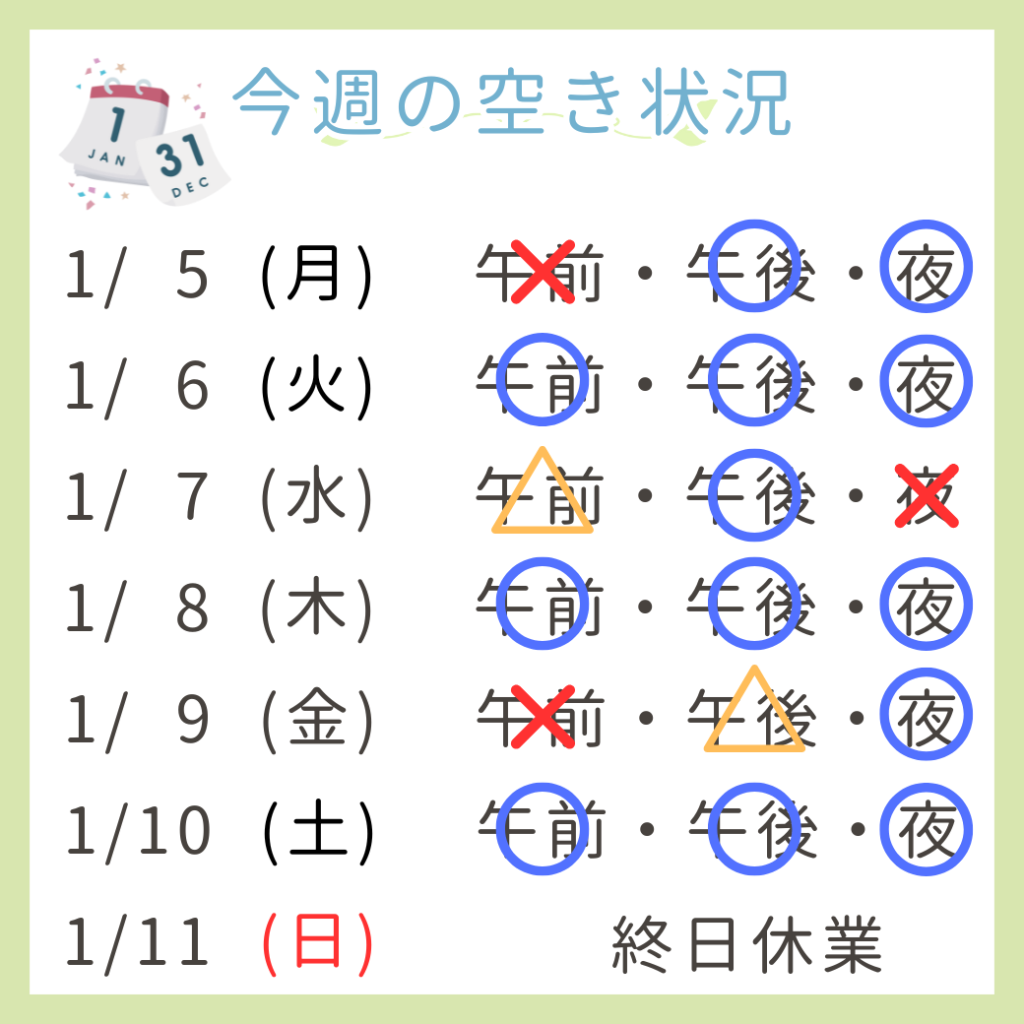 今週1/5(月)〜1/11(日)の予約の現時点の空き状況になります🗓️