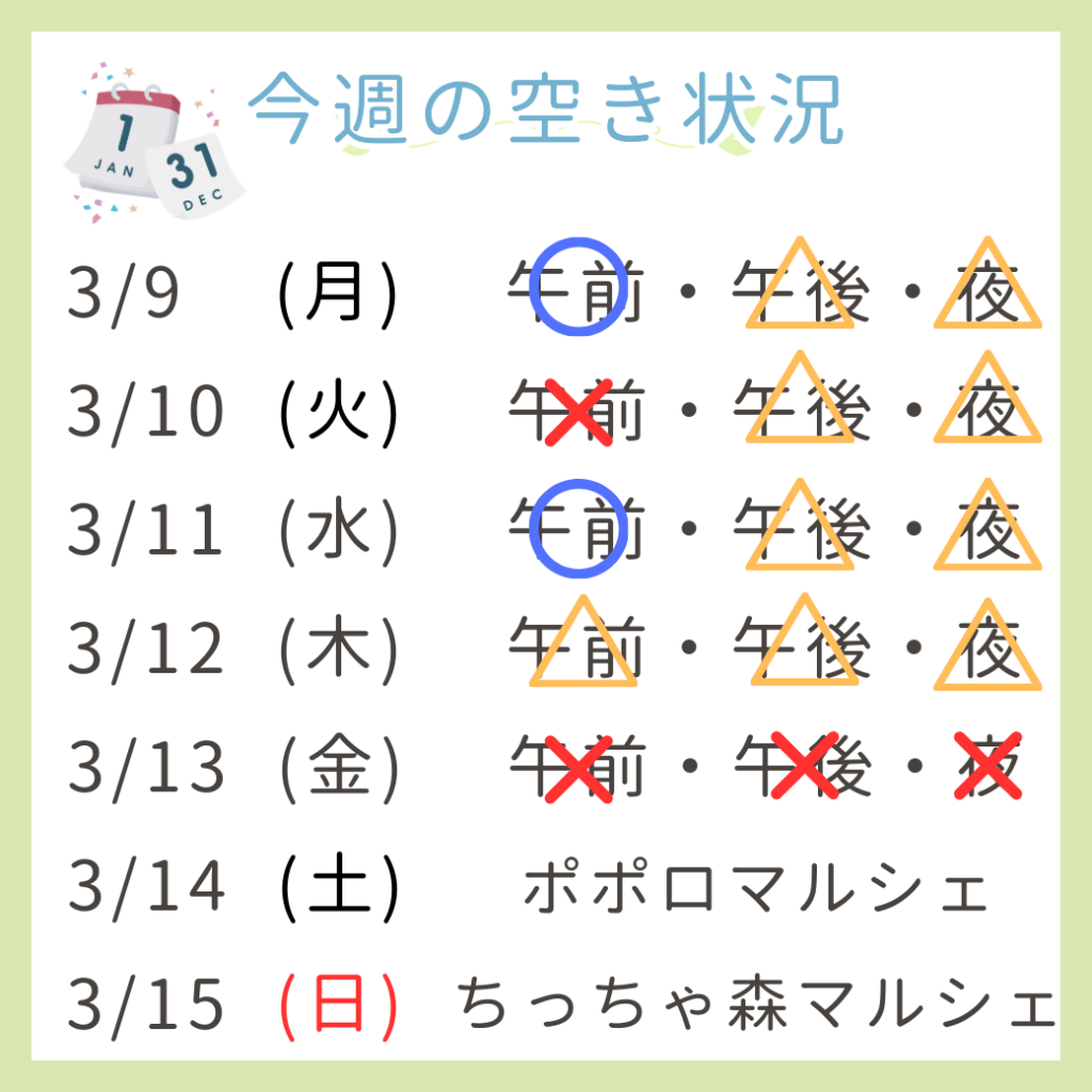 今週3/9(月)〜3/15(日)の予約の現時点の空き状況になります🗓️